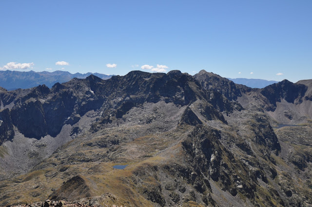A l'est, du Malcaras aux sommets andorrans. En contrebas, l'étang de Roumazet à gauche et l'étang de la Soucarrane à droite.